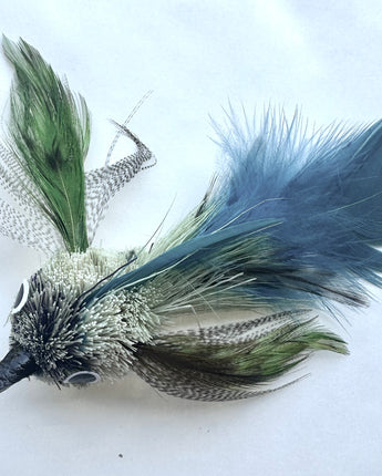 - Made of deer hair with a real colorful feathers about the size of a hummingbird.