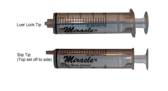 20 ml Miracle Oring Syringe. Nothing beats the Miracle Oring Syringe with it's ease of glide even with many repeated uses. Once you use the Miracle Oring Syringe you'll never use anything else! Each syringe is sterile packed and BPA free. Available in a slip tip or a luer lock tip. When choosing your syringe tip we offer the following guidelines: Slip Tip works with a Catac ST1 Nipple, Canula Tip, Medical Needle Luer Lock Tip works with The Miracle Nipple, PetAg 2 oz. Nipples, PetAg Elongated Nipples, Four Paws Nipples, Canula Tip, Medical Needle